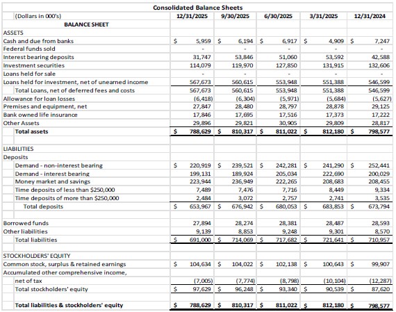 - Loans grew by $7.1 million or 1.3% in the fourth quarter and $21.7 million or 3.9% for the year ended 2025
