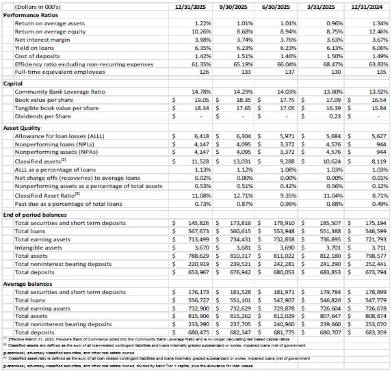 The Bank’s leverage ratio was 14.78% as of December 31, 2025, compared to 14.29% as of September 30, 2025. The Company’s tangible common equity was $94.0 million as of December 31, 2025, compared to $92.6 million as of September 30, 2025.