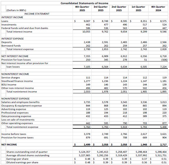 “I’m pleased with our 2025 results, which displayed improved efficiency, expanded net interest margin and stronger profitability with higher Return on Average Assets and Earnings per Share. We benefited from moderate loan growth, which contributed to our higher interest income and lower funding costs during the year. Together, these factors delivered solid growth in net income for 2025,” reported Julia Beattie, President and CEO.