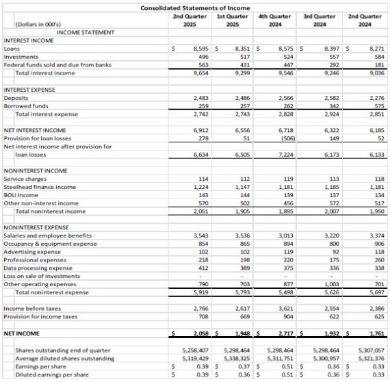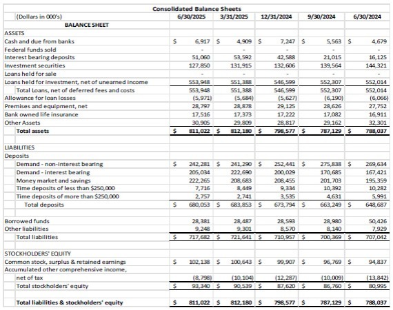 The Bank’s leverage ratio was 14.29% as of September 30, 2025, compared to 14.03% as of June 30, 2025. The Company’s tangible common equity was $92.6 million as of September 30, 2025, compared to $89.7 million as of June 30, 2025.