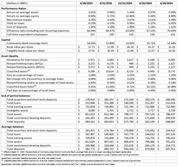Medford, Oregon – October 22, 2025 – PBCO Financial Corporation (OTCPK: “PBCO”), the holding company (the “Company”) of People’s Bank of Commerce (the “Bank”), today reported net income of $2.1 million and earnings per share of $0.39 for the third quarter of 2025, compared to net income of $2.1 million and $0.39 per share for the second quarter of 2025.